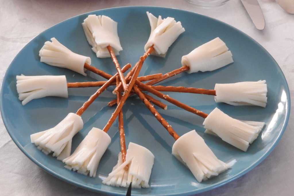 Après les fantômes, aux sorcières avec un autre succès trop rigolo : les balais avec des gâteaux apéritifs « sticks », vous avez, ceux qui sont mélangés avec des bretzel dans la boîte de la marque Ancel ! La brosse du balais est réalisée avec le, même fromage en « plaquette » que les fantômes. Par contre, comme il y a des intolérants au lactose dans ma belle-famille, j’ai pris du fromage de chèvre ou brebis, je ne sais plus, mais qui est plus friable que les carrés de fromages pour burger en lait de vache, donc le rendu est un peu moins nickel. Mais ça rend quand même très bien !
