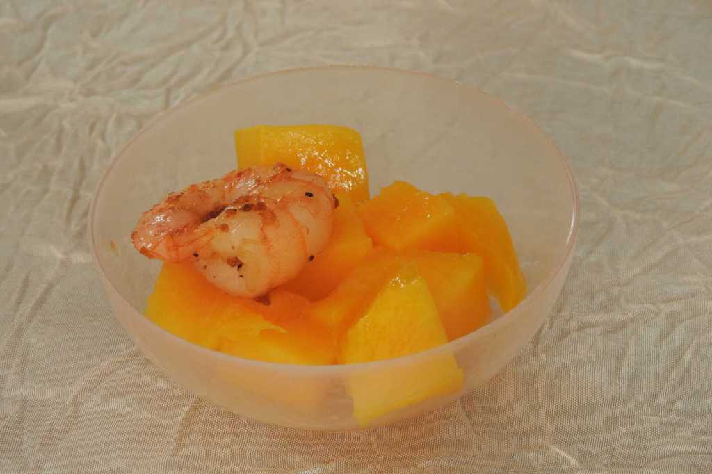 Pour le reste, j’ai tout misé sur la couleur orange : velouté de courge, saumon fumé, crevettes rôties au curry avec des morceaux de mangue :