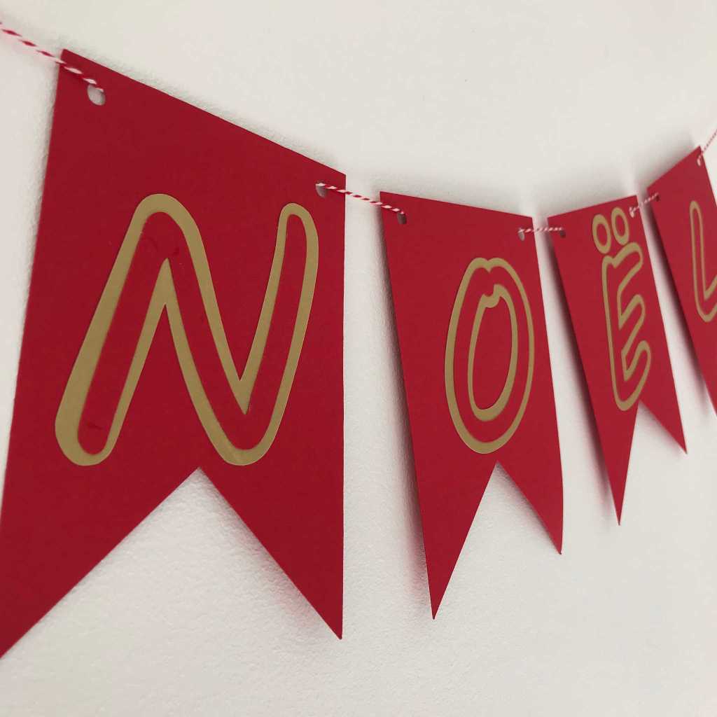 On commence par une banderole « Noël », découpée dans de beaux papiers Pollen de Clairefontaine, en rouge et or :
