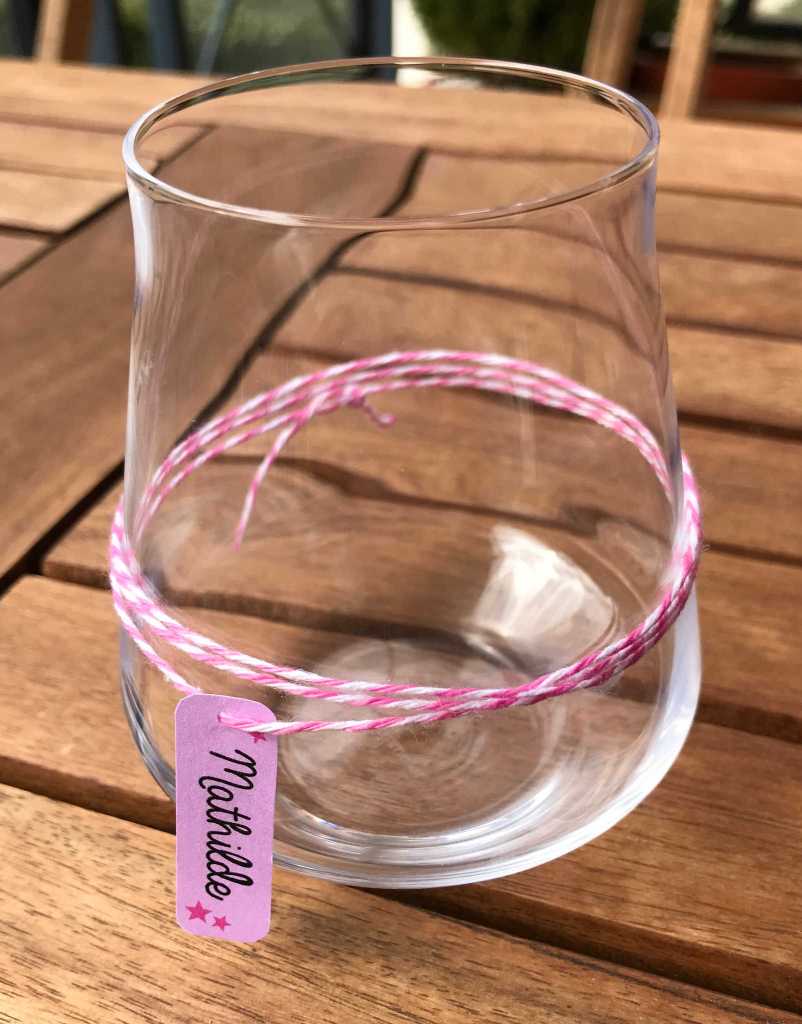 Technique très simple mais qui fait de l’effet ! La seule contrainte est d’avoir des verres avec un pied ou qui sont un peu ventrus, pour que la ficelle reste bien en place. Il vous suffit d’imprimer les étiquettes, un petit trou, de la ficelle assortie à la déco, et hop ! J’ai utilisé ici une ficelle appelée « Baker’s Twine », de Toga, que j’ai achetée sur le site La Fourmi Créative.
