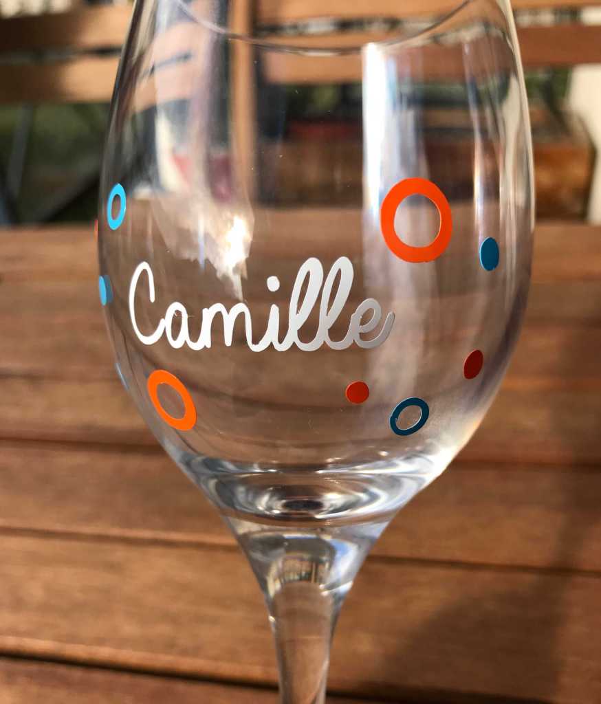 Autre possibilité : décorer les verres avec du vinyl coloré. Cette technique me parait compliquée à utiliser si on n’a pas de machine de découpe, à moins d’utiliser un motif simple et de jouer avec des couleurs différentes par verre par exemple. Par contre, si vous avez une Silhouette, une Cricut ou autre machine de découpe, vous pouvez vous faire plaisir avec des motifs plus fins ou des prénoms ! Le vinyl ne sera pas tenace, il résistera très bien à la soirée mais pas au lave-vaisselle 😉
