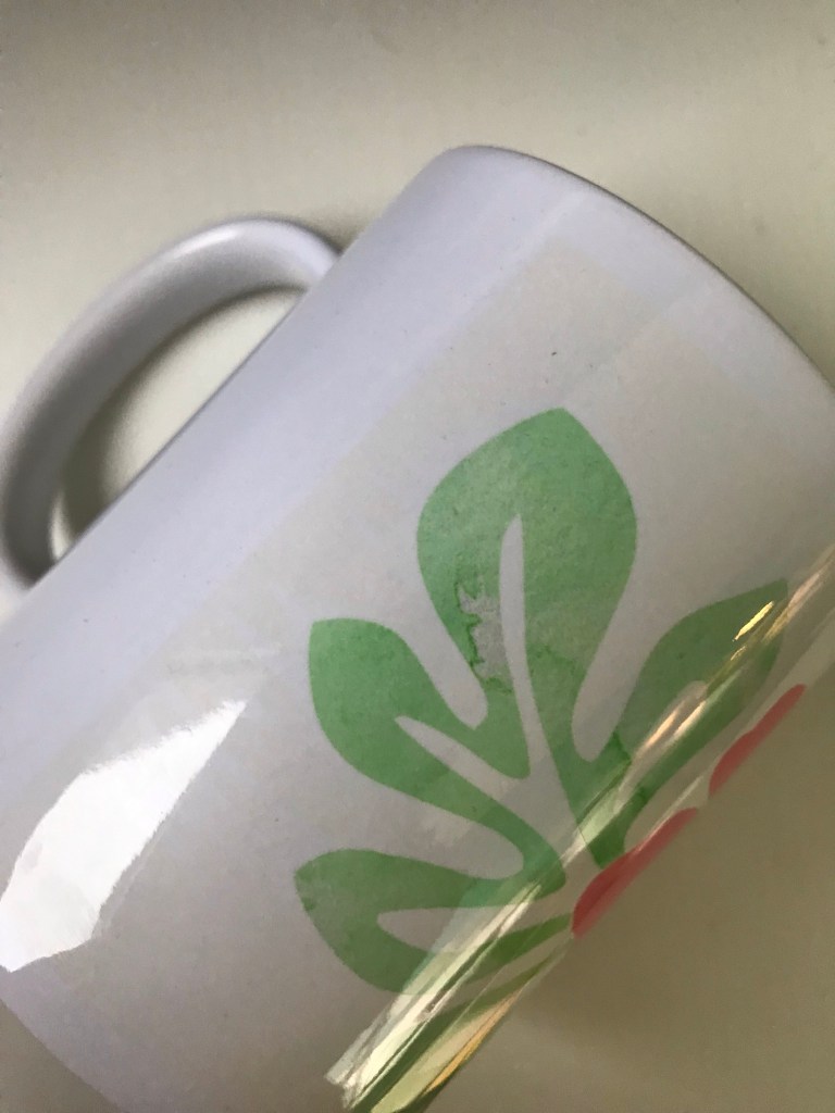Et oui, malgré tout le respect des consignes, il peut arriver qu’on ait quelques soucis ! Et notamment mon problème c’est que j’ai des traces jaunes très marquées autour des dessins, là où il y avait du papier « transfert » d’infusible ink (j’entends par là que quand on découpe un motif, on échenille ce qui ne nous intéresse pas mais en général on laisse la partie auto-collante qui était dessus, pour maintenir le motif sur la tasse). Et ça, ça craint ! voici un exemple :