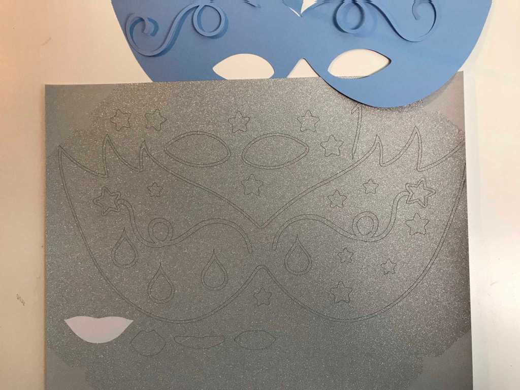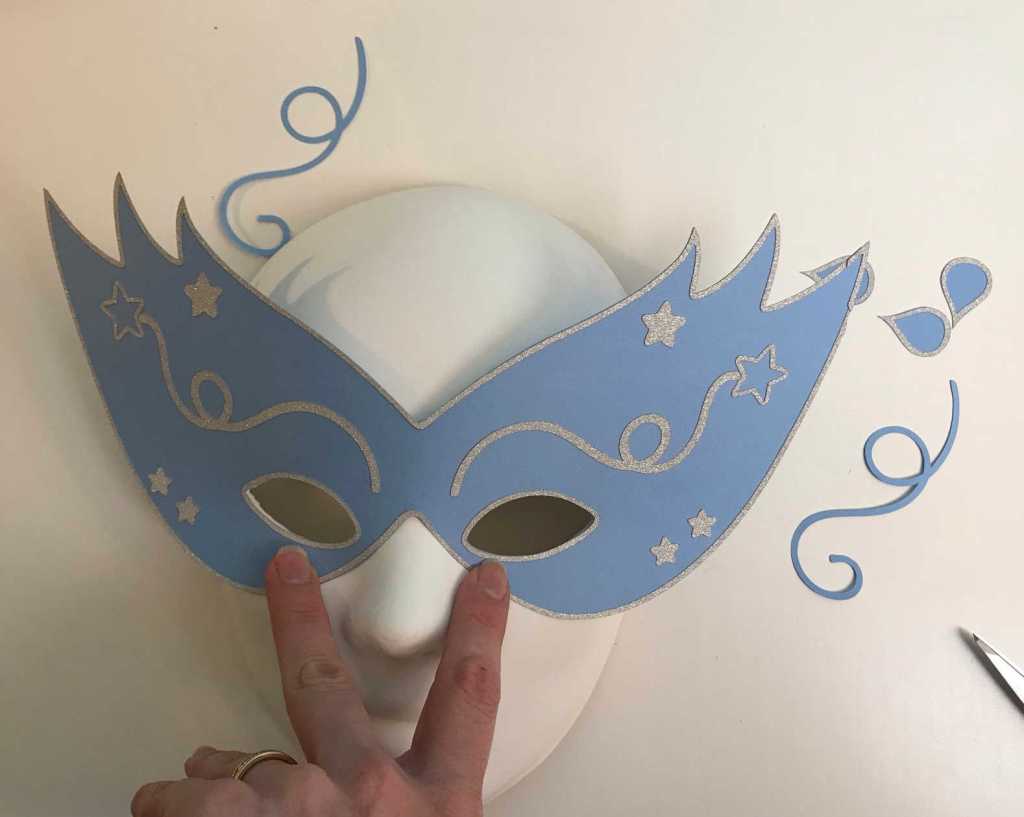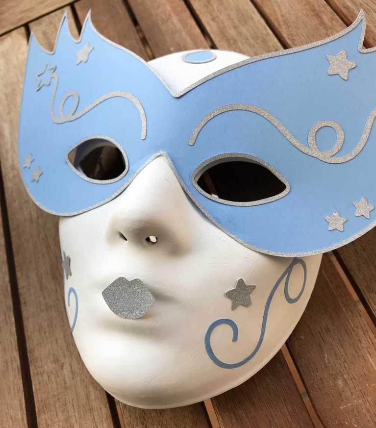 - il ne vous reste plus qu’à compléter en collant les éléments restants (même si votre papier pailleté est autocollant, je vous conseille de rajouter de la colle blanche pour une meilleure tenue sur le masque)