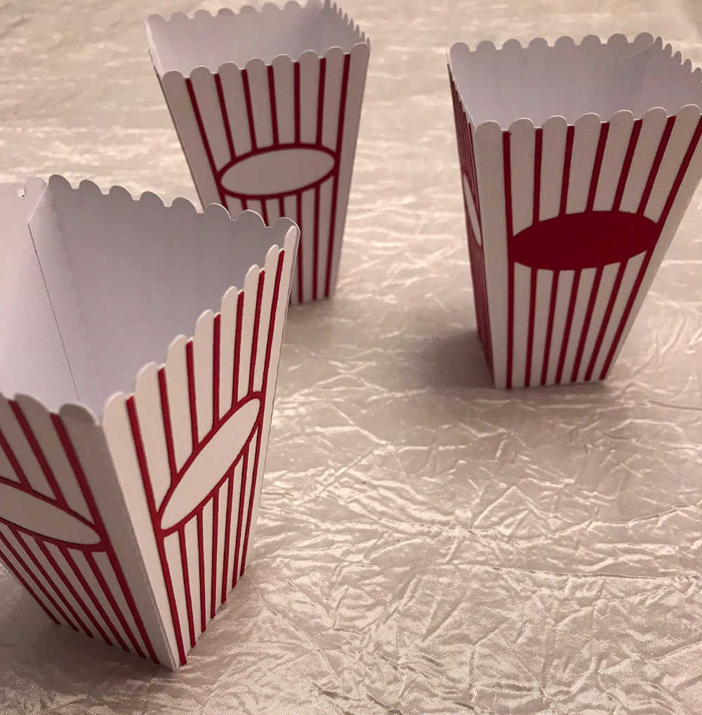 Evidemment quand on se lance dans une fête « cinéma », il faut du pop Corn :D. J’ai donc réalisé ces boîtes pour chacun des invités. Si vous souhaitez également faire les vôtres, je vous conseille de mettre du papier cuisson à l’intérieur pour protéger le pop corn de toute trace de colle par exemple.