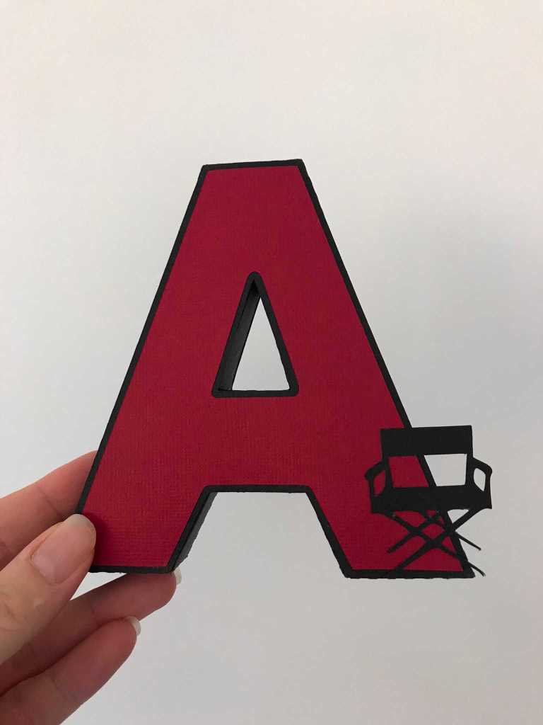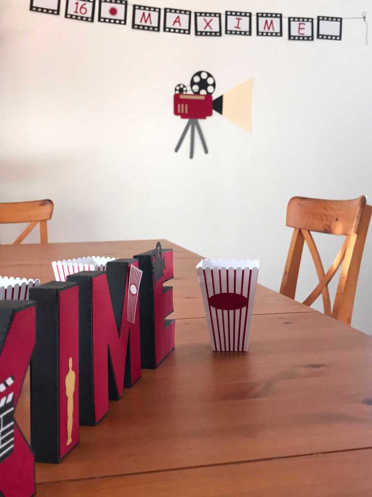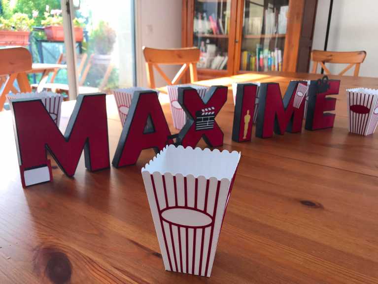 J’ai également réalisé des lettres 3D recréant le prénom de la star de la fête, que j’ai orné de découpes cinéma, par exemple le A :