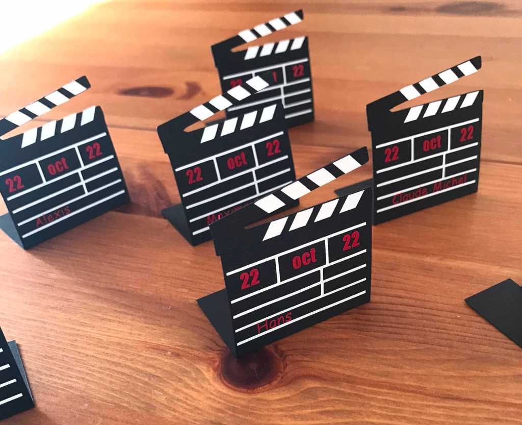 Et pour finir, des marque-place « clap » pour la table ! Ceux là sont un peu plus délicat à faire, notamment à cause de la petitesse des découpes ; si vous n’avez pas de machine de découpe et de vinyl, je vous conseille de plutôt l’écrire à la main.