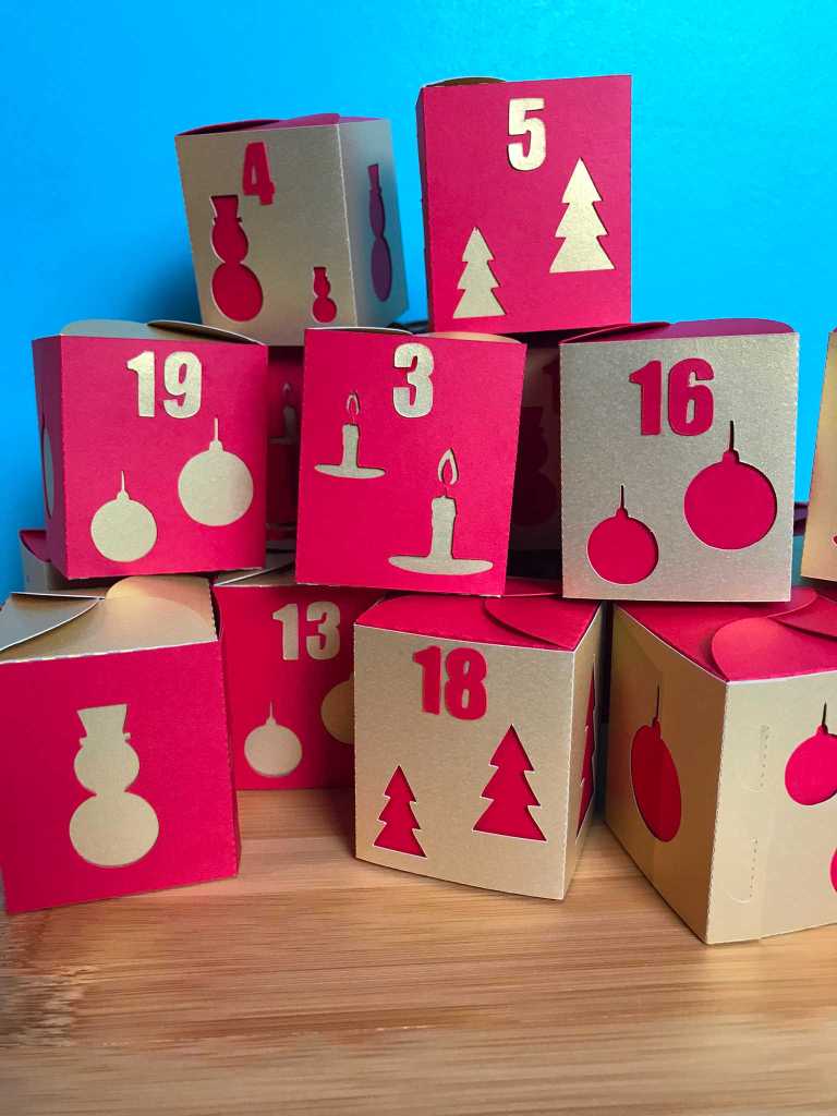Les boîtes comme les bandeaux se montent sans colle, donc sont faciles à ranger à plat et à réutiliser l’année suivante. Leur montage est aussi plus rapide et plus facile, pratique si vous en avez 24 à faire, ou si vous les utilisez pour des boîtes à dragées par exemple ! Les patrons sont disponibles en 3 formats : PDF pour découpes à la main, Silhouette studio v3 pour machine de découpe Silhouette et un lien vers Cricut Design Space pour machine type Cricut Maker.