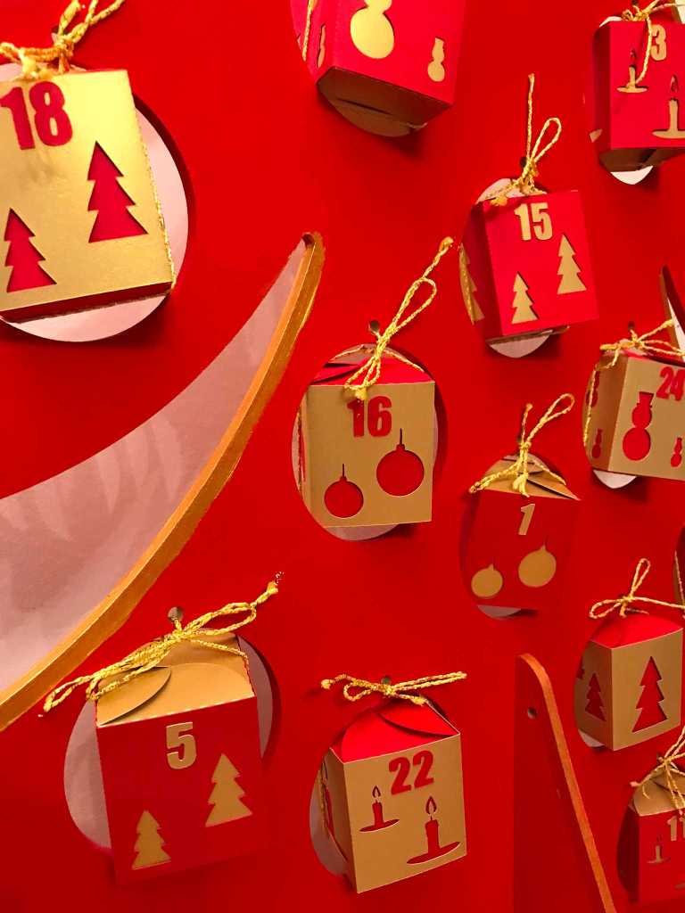 Cette année, j’ai eu envie de le compléter avec un calendrier de l’Avent fait maison. Je suis partie du patron du calendrier de l’Avent Banquise, mais j’ai réduit un peu les boîtes pour qu’elles puissent rentrer dans les trous du sapin, et j’ai choisi de les décorer par des genre de bandeaux découpés, plutôt que de les découper elles-mêmes. Ainsi elles n’ont aucune transparence, sont plus solides et je compte vous proposer plein de modèles de bandeaux différents pour vos évènements autres que Noël.