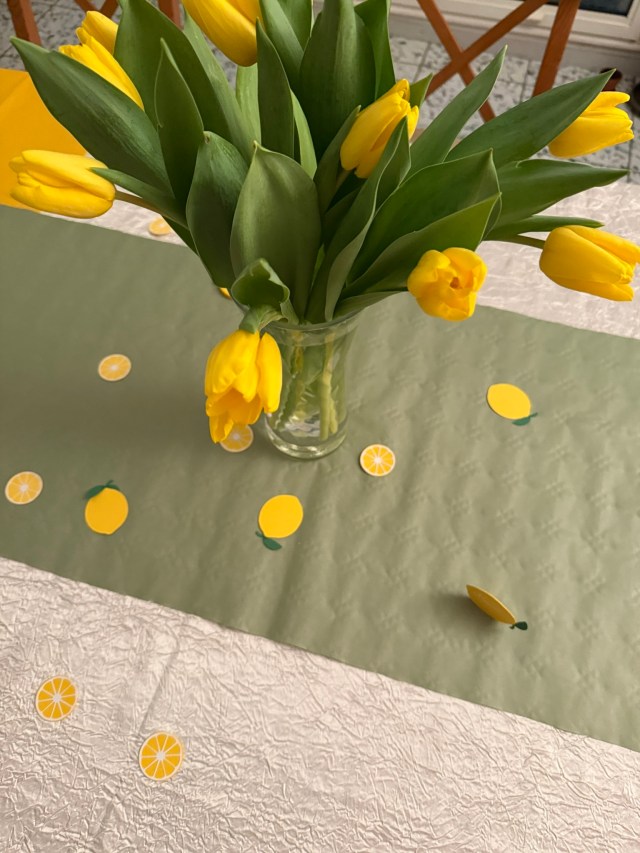 - et des fleurs ! Au départ, je voulais du mimosa, mais il n’y en avait pas chez le fleuriste (peut-être qu’on est encore un peu tôt dans la saison), alors j’ai opté pour des tulipes jaunes. Au final leurs couleurs étaient parfaitement assorties à la table !