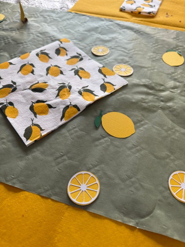 J’ai découpé quelques citrons et leurs feuilles et quelques « tranches » de citron, honnêtement petit effort, chouette effet. Si vous n’avez pas de machine de découpe (ici j’ai découpé avec ma Silhouette Cameo), je vous conseille plutôt de soit imprimer les rondelles jaunes avec le blanc, soit de dessiner au feutre blanc (Posca par exemple) pour ne pas trop galérer avec les découpes blanches.